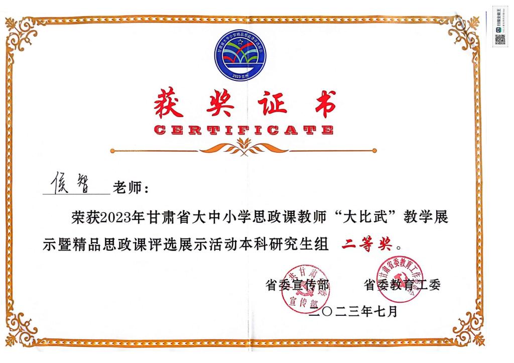 bevictor伟德官网教师侯智在甘肃省2023年大中小学精品思政课评选中获奖