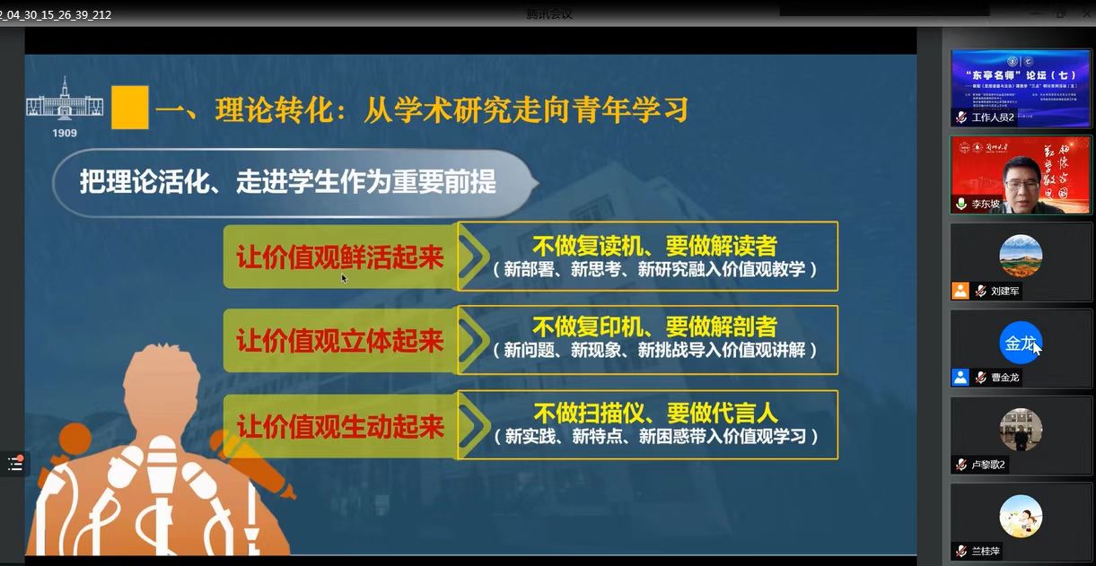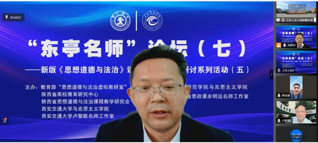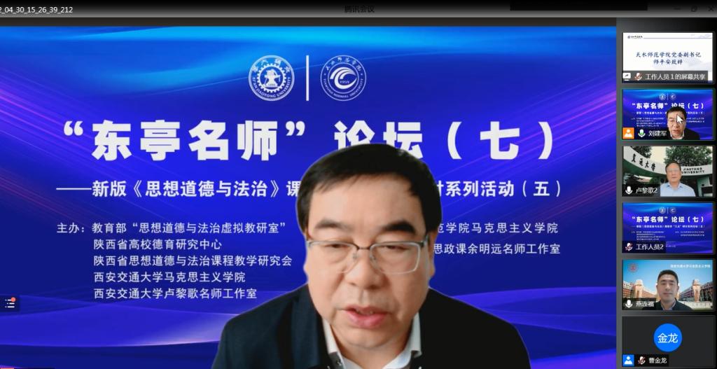 为学习贯彻习近平总书记在公司思政课教师座谈会上和近期考察中国人民大学时的重要讲话精神,进一步提升思政课教师教学水平与研究能力,4月30日,“名家领航 协同共进——《思想道德与法治》教学‘三点’研讨系列活动”第五次会议在天水师范公司举办。本次活动由教育部“思想道德与法治虚拟教研室”、陕西省高校德育研究中心、陕西省思想道德与法治课程教学研究会、bevictor伟德官网、西安交通大学卢黎歌名师工作室与bevictor伟德官网、甘肃省思政课余明远名师工作室联合举办,通过网络研讨会议方式进行。天水师范公司党委副书记师平安出席会议并致开幕辞,西安交通大学卢黎歌教授,兰州大学王学俭教授,上海交通大学bevictor伟德官网经理邢云文教授,bevictor伟德官网经理燕连福教授、思想政治教育研究所所长杨华副教授,bevictor伟德官网全体教师及省内外高校专家学者、大中小思政课教师共计1275人参加本次会议。