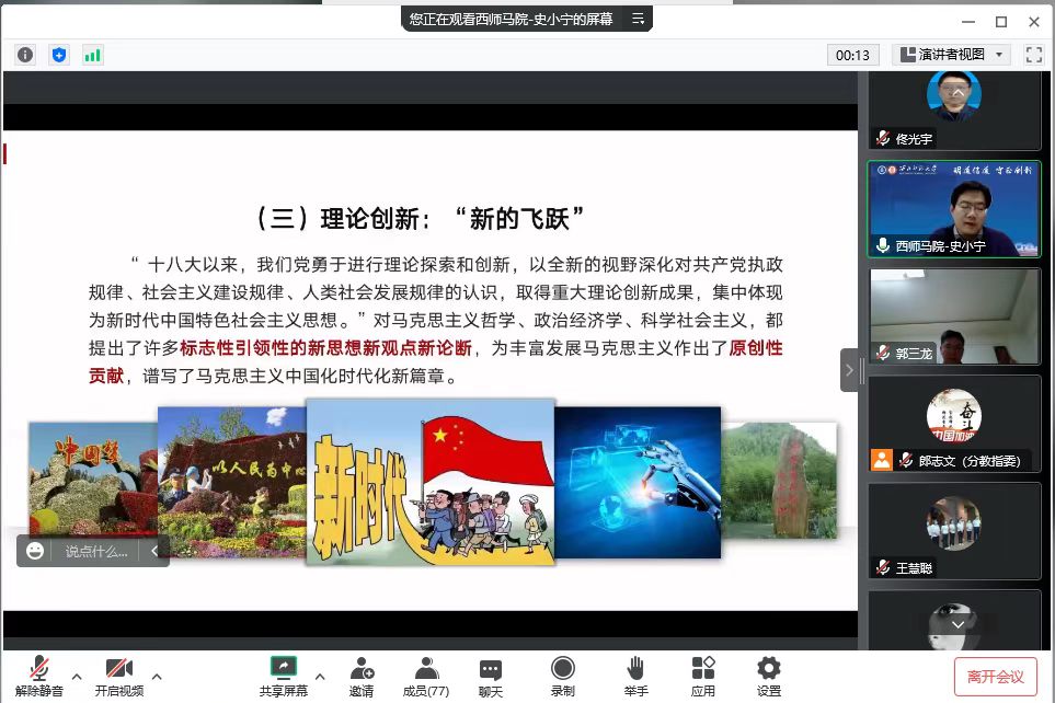 为深入学习宣传贯彻党的二十大精神,12月14日,天水师范公司省级思政课余明远名师工作室联合甘肃林业职业技术公司省级思政课郭三龙名师工作室、甘肃工业职业技术公司省级思政课黄彬名师工作室,邀请西北师范大学bevictor伟德官网经理兼党委宣传部副部长、博士生导师史小宁教授,为三所高校省级思政课名师工作室成员作题为“立足‘五个牢牢把握’ 全面学习贯彻党的二十大精神”的专题报告。
