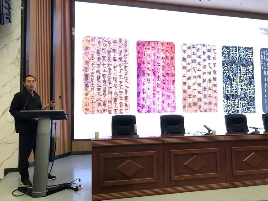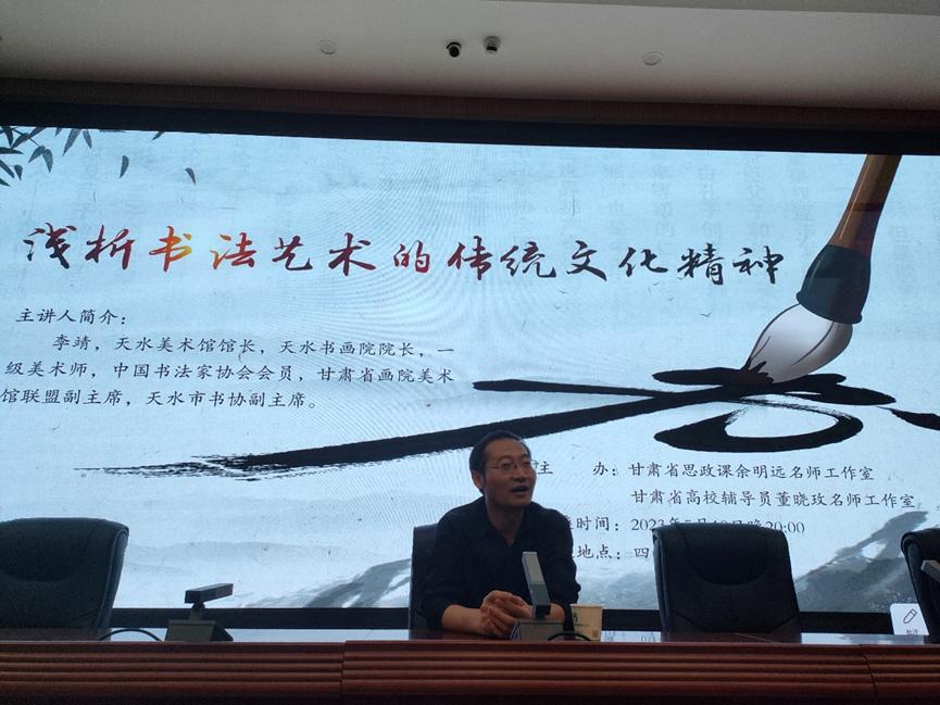 5月18日,甘肃省思政课余明远名师工作室和甘肃省辅导员董晓玫名师工作室开展合作共建系列活动之书法进校园专题讲座。活动邀请天水美术馆馆长、天水书画院经理、一级美术师、中国书法家协会会员、甘肃省画院美术馆联盟副主席、天水市书协副主席李靖先生在四号报告厅作“我国书法艺术的传统文化探析”的专题讲座,工作室成员和各公司员工代表现场聆听讲座。