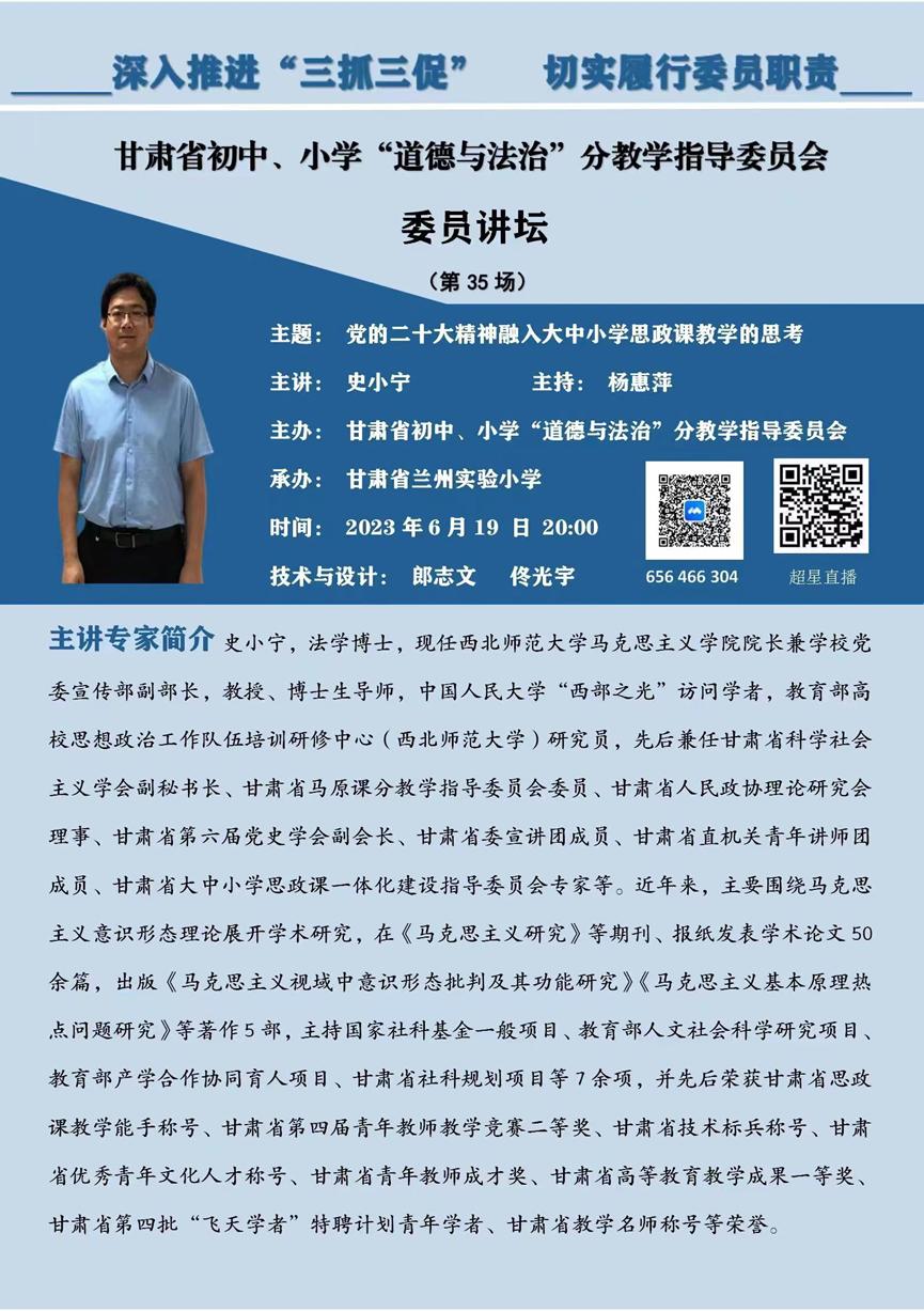 甘肃省初中、小学“道德与法治”分教学指导委员会委员、省级名师工作室主持人余明远、刘永兰、曹生财、杨惠萍、白永强、贾秀琴、王慧聪、冯正义老师组织工作室成员结合讲座内容,围绕“以什么样的视野、站在什么样的角度、采用什么样的方式,将党的二十大精神融入中小学思政课教学”进行了研讨交流并分享了各自一些创新性的见解和做法。(来源:甘肃省初中、小学“道德与法治”分教学指导委员会)