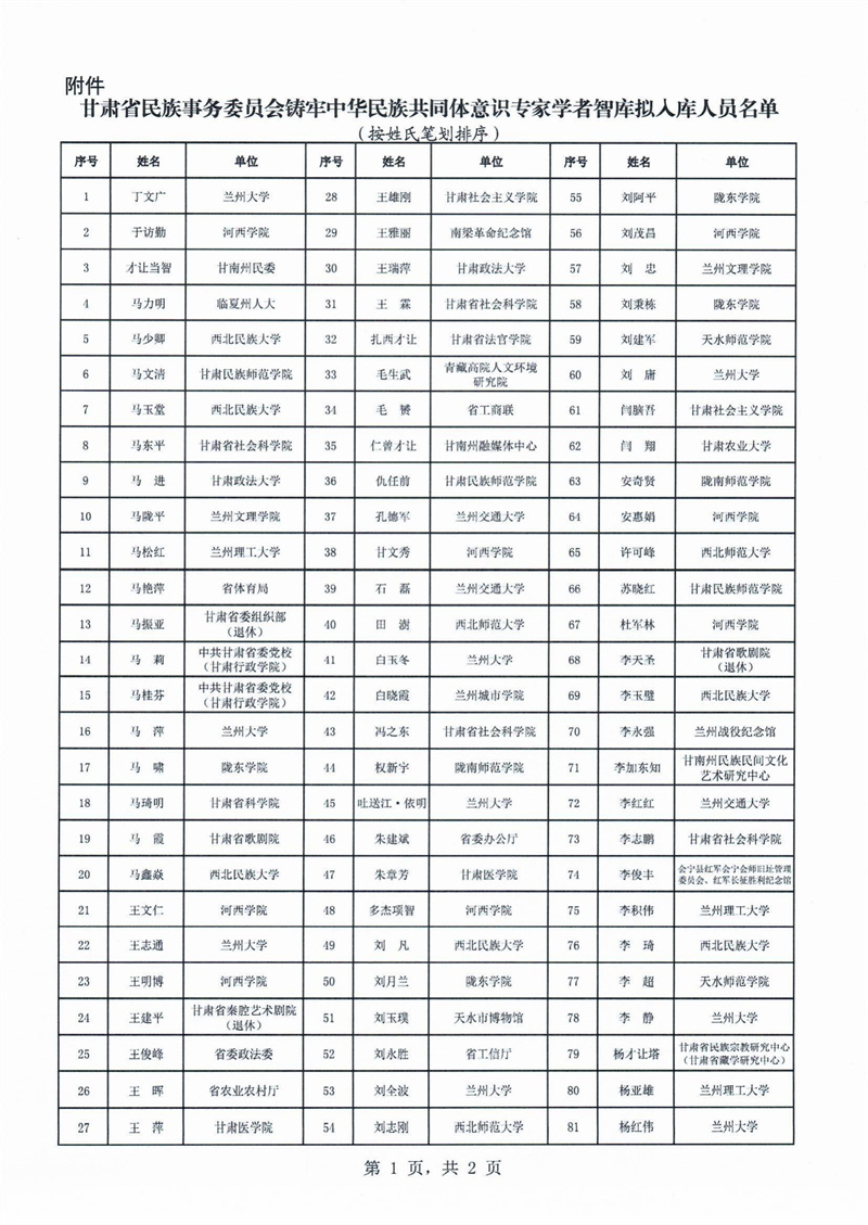 附件:甘肃省民族事务委员会铸牢中华民族共同体意识专家学者智库入库人员名单